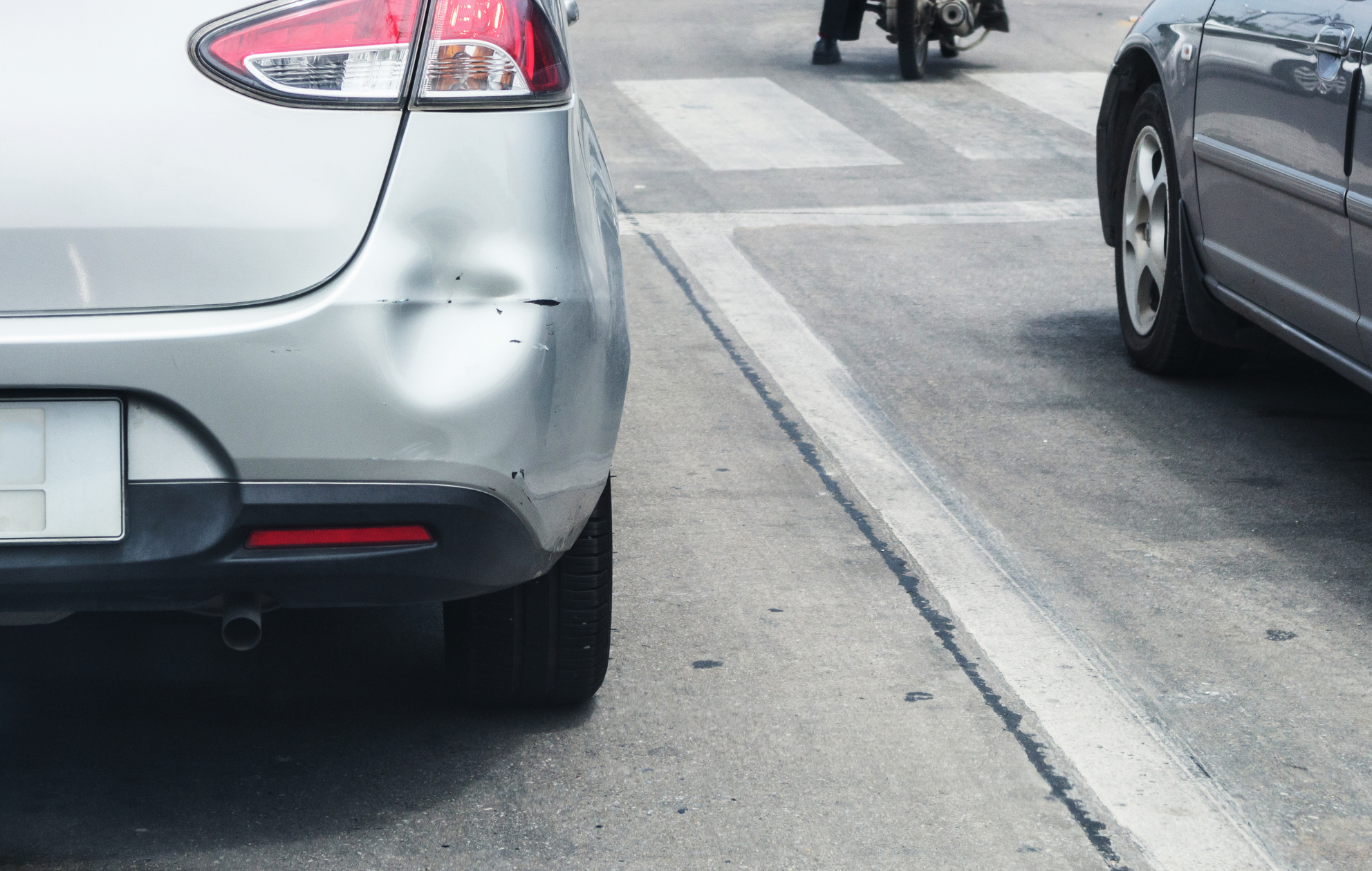Dented bumper showing the damage from a car accident during the holidays.